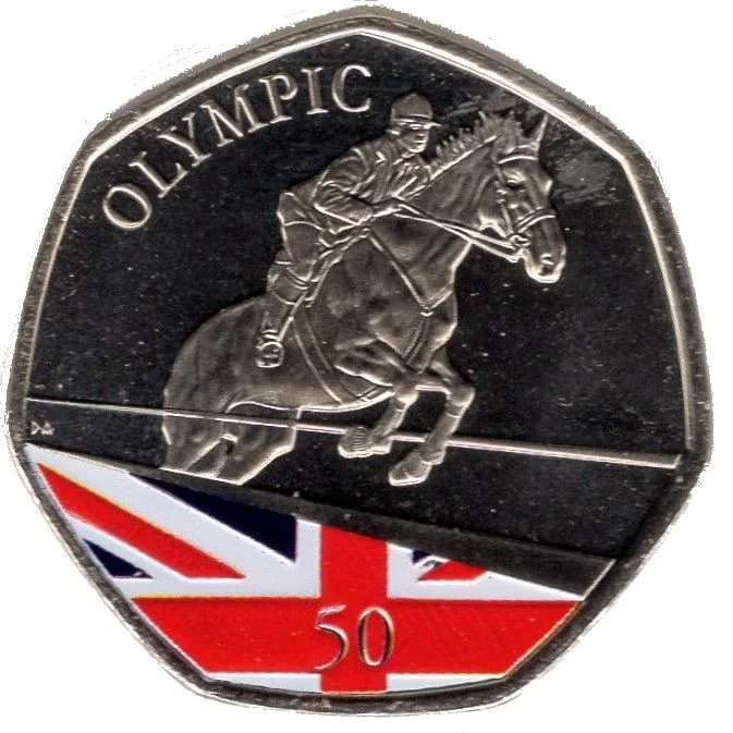 Equestrian showjumper leaping a fence, with a colorized Union Jack.
