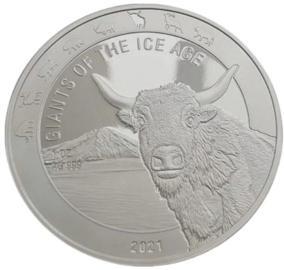 Features an aurochs, with legends of Ice Age giants, plus the date, purity, weight, and animal outlines for the series.