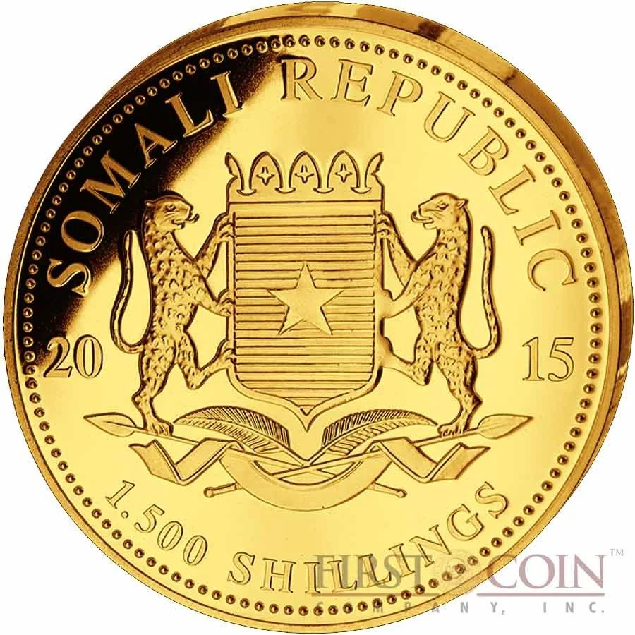 Somalia's coat of arms divides the date and denomination.