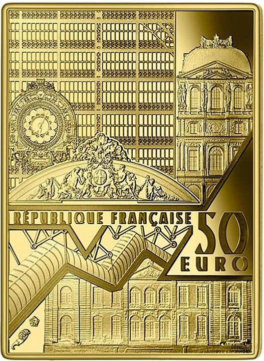 Architectural details of five Paris museums: Orsay, Louvre, Picasso, Rodin, and Pompidou.