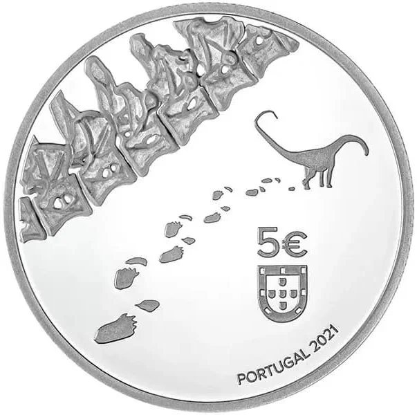This coin features the glowing vertebrae of Dinheirosaurus on its upper left. Below, a trail of footprints leads to the dinosaur's silhouette. The lower right shows the face value, national shield, and the border inscription "Portugal 2021".