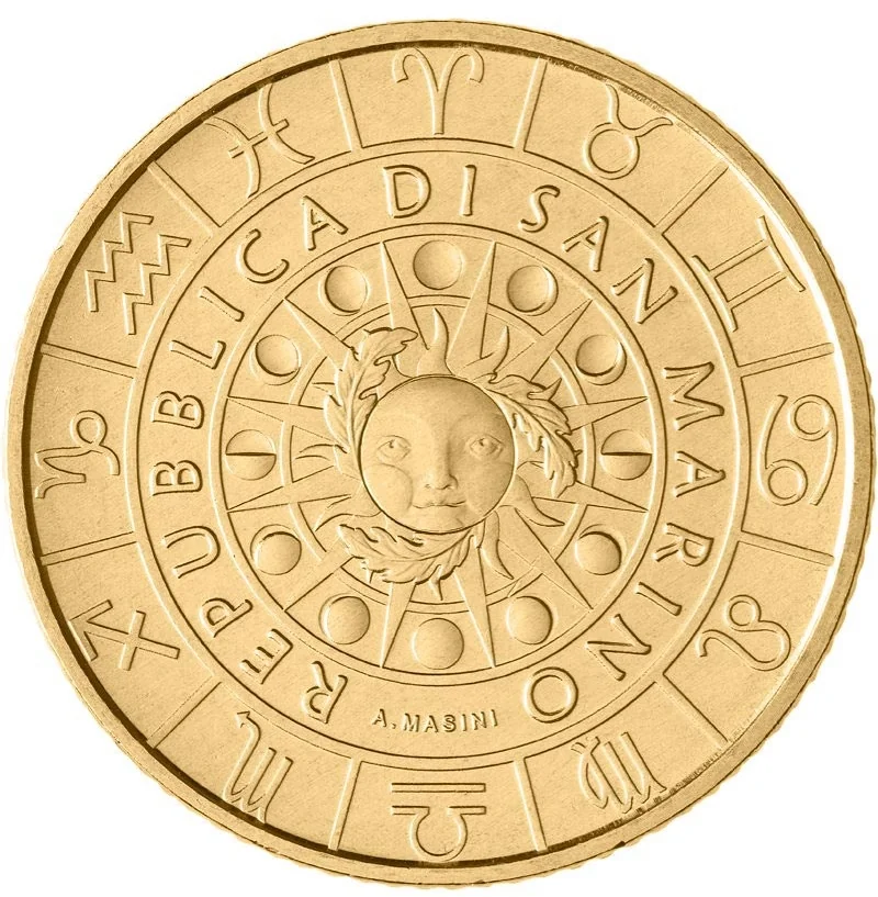 The shared obverse features a central sun surrounded by lunar phases, three feathers symbolizing San Marino, and the twelve astrological signs along the edge.