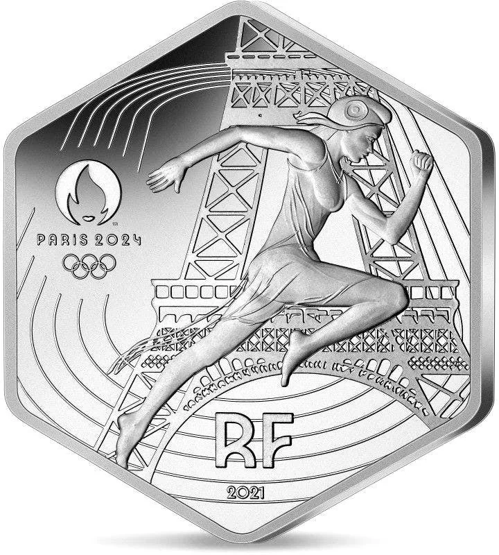 The obverse features a running Marianne overlooking the Olympic stadium, with the Eiffel Tower in the background.
