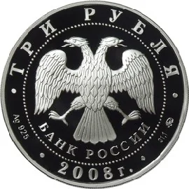 Central: Bank of Russia emblem (two-headed eagle, wings down, with "БАНК РОССИИ" below), encircled by dots. Rim inscription: top - "ТРИ РУБЛЯ"; bottom left - metal and fineness, centre - "2008 г.", right - metal content and mint mark.