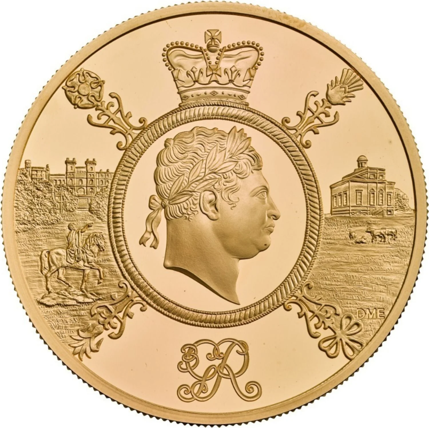 George III's "bull head" portrait at the coin's center, encircled by the symbols of his kingdoms and framed by his crown.