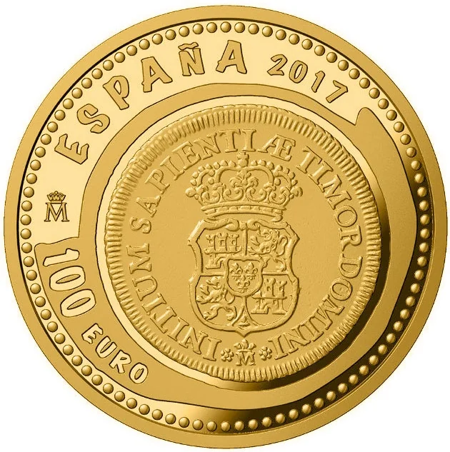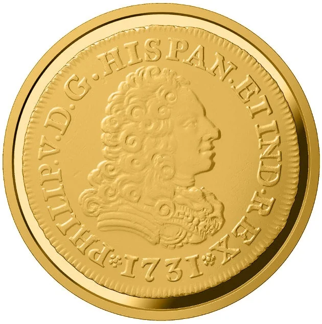Reverse: The 1731 Madrid 2 Escudos coin (KM# 352) features the Royal Coat of Arms of Castilla y León, with Granada in point and Bourbon fleurs-de-lis at the center.
