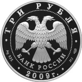 Center: Bank of Russia emblem (two-headed eagle, wings down, with "БАНК РОССИИ" below), within a dotted circle. Rim inscriptions: top - "ТРИ РУБЛЯ"; bottom left - metal and fineness; center - "2009 г."; bottom right - metal content and mint mark.