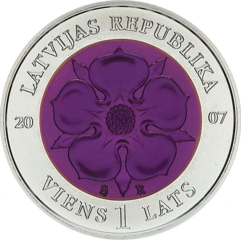 A heraldic rose with the letters H and R below it is centered on the coin. "LATVIJAS REPUBLIKA" arches above, the split year "2007" is on either side, and "VIENS 1 LATS" arches below.