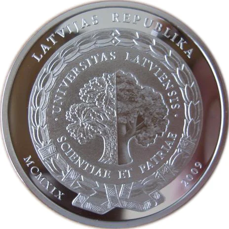 The central motif is the University of Latvia's coat of arms: an oak (symbolizing its faculties) within a laurel wreath, inscribed UNIVERSITAS LATVIENSIS above and SCIENTIAE ET PATRIAE below. The oak's left side is in relief and its right is a photo image, symbolizing "dry" science versus jolly life. Above is LATVIJAS REPUBLIKA; below, MCMXIX (1919) and 2009 are to the left and right.
