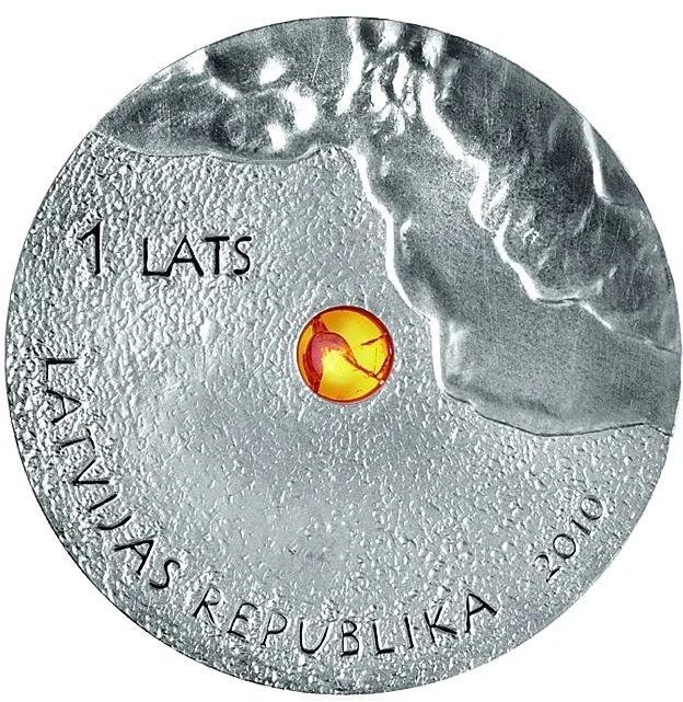 A transparent amber cylinder is set into the coin's center. The obverse features "1 LATS" and sea waves above, with "LATVIJAS REPUBLIKA 2010" in a semi-circle below.