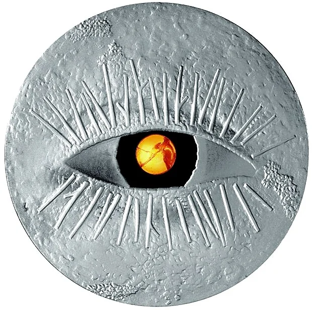 After forty million years, amber met its first human. An amber-pupiled eye gazes from the coin's reverse.