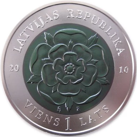 A heraldic rose with the letters H and R below it is at the coin's center. "LATVIJAS REPUBLIKA" arches along the top outer ring, the divided year "2010" flanks the center, and "VIENS 1 LATS" curves along the bottom.