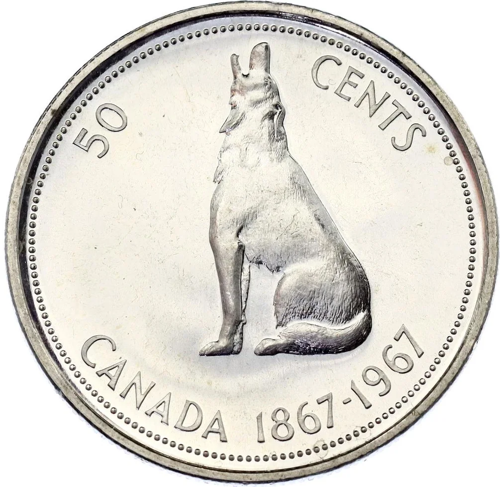Wolf howling, dates 1867-1967 beside country name, denomination above.