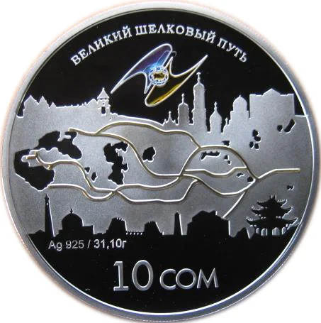 Multicolored logo above, skyline and Silk Road map below, denomination at bottom.