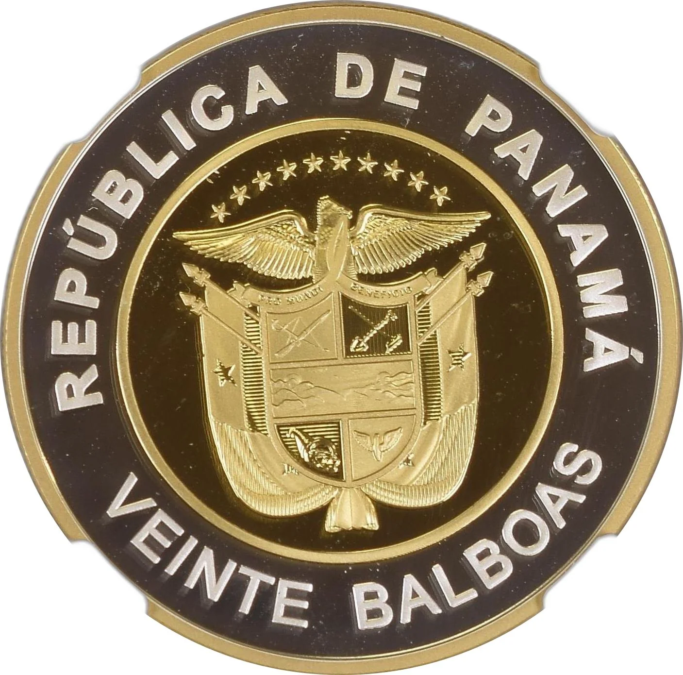 Coat of arms of Panama, country name above, value below.