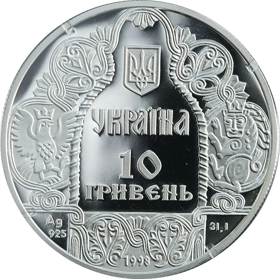 This coin features a 12th-century Halych church ornament with the symbolic bird of Halych and lion of Lviv. It bears the small National Emblem of Ukraine, the inscriptions УКРАЇНА, 10 ГРИВЕНЬ, 1998, and specifications of the metal, fineness, and weight.