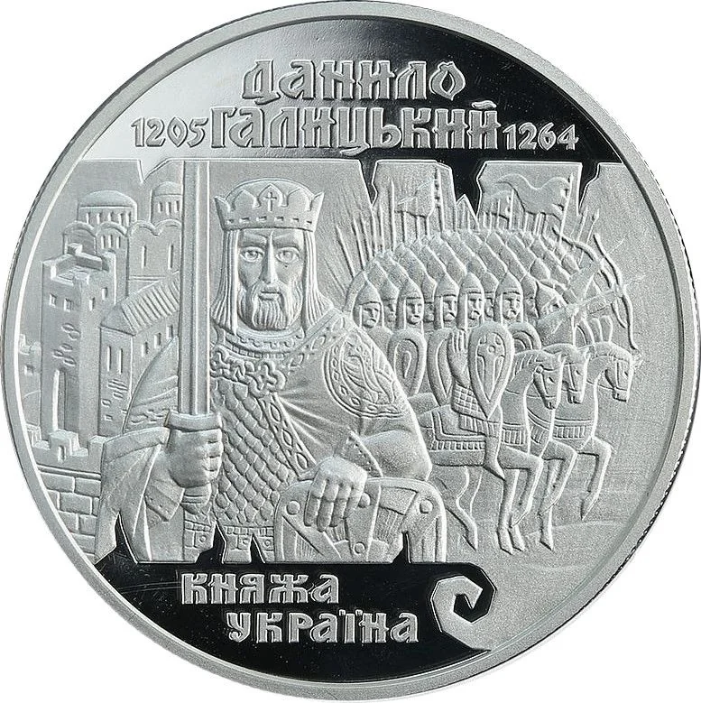 A three-view composition on a coin roll features Prince Danylo of Halych in warrior attire, old-Rus buildings, and his troops. The legend reads: "ДАНИЛО ГАЛИЦЬКИЙ 1205-1264" above and "КНЯЖА УКРАЇНА" below.