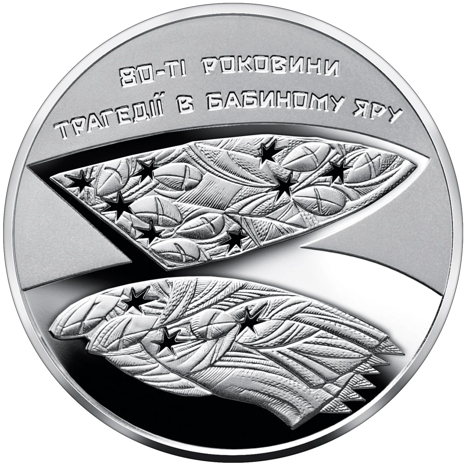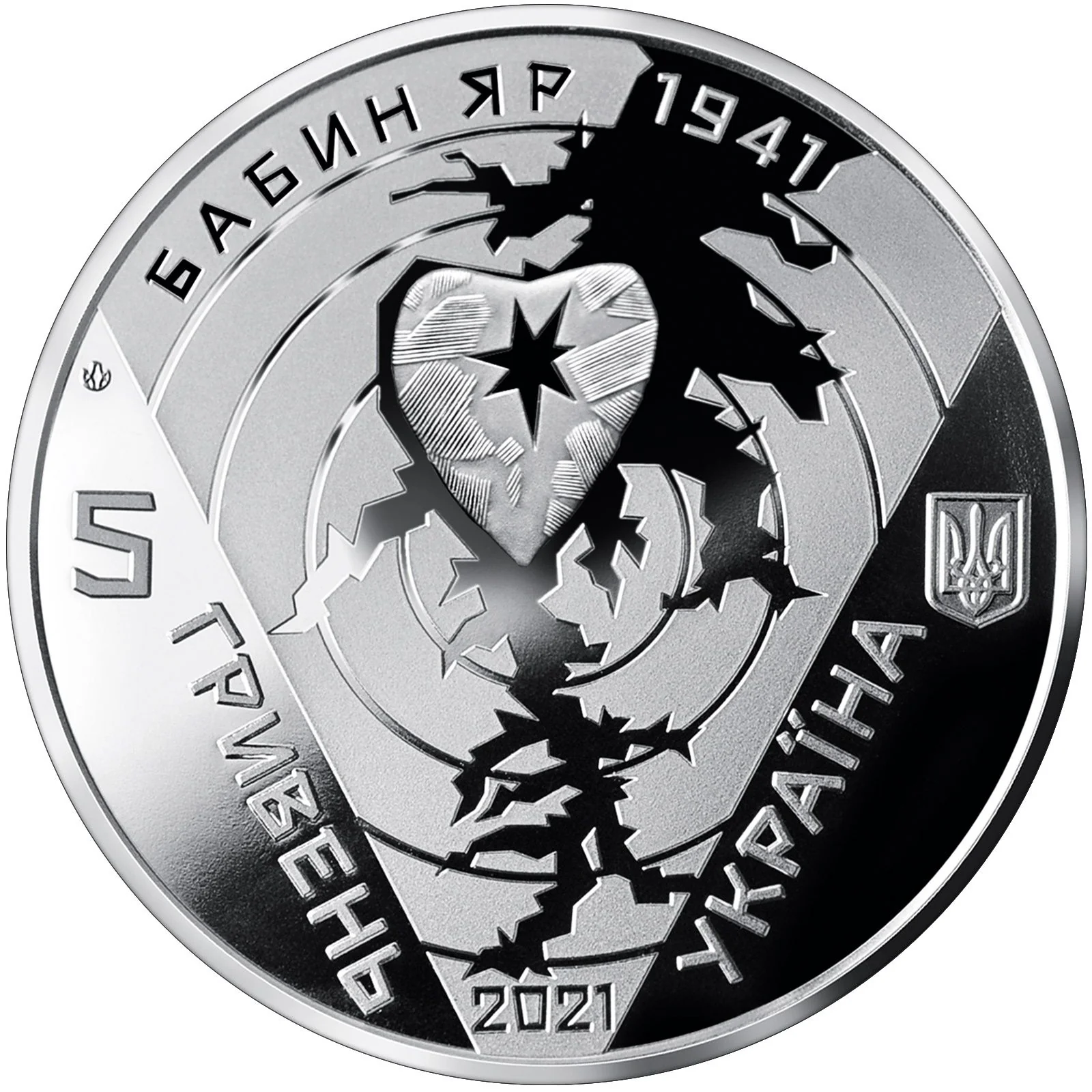 Description: Right: Ukraine's small coat of arms with "УКРАЇНА" below. Left: the face value "5 ГРИВЕНЬ". Center, on concentric circles and a topographic fragment of Babyn Yar resembling blood splashes, is a stylized heart with a bullet hole. Legends: "БАБИН ЯР 1941" above and "2021" below. The mint mark is at upper left.