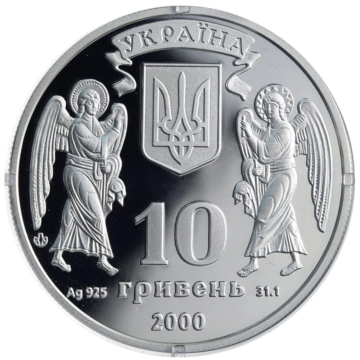 Description: The coin's reverse features Ukraine's small National Emblem flanked by angels. The inscriptions include "УКРАЇНА," "10 / ГРИВЕНЬ / 2000," "Ag 925," "31,1" (fine weight), and the NBU Mint logotype.
