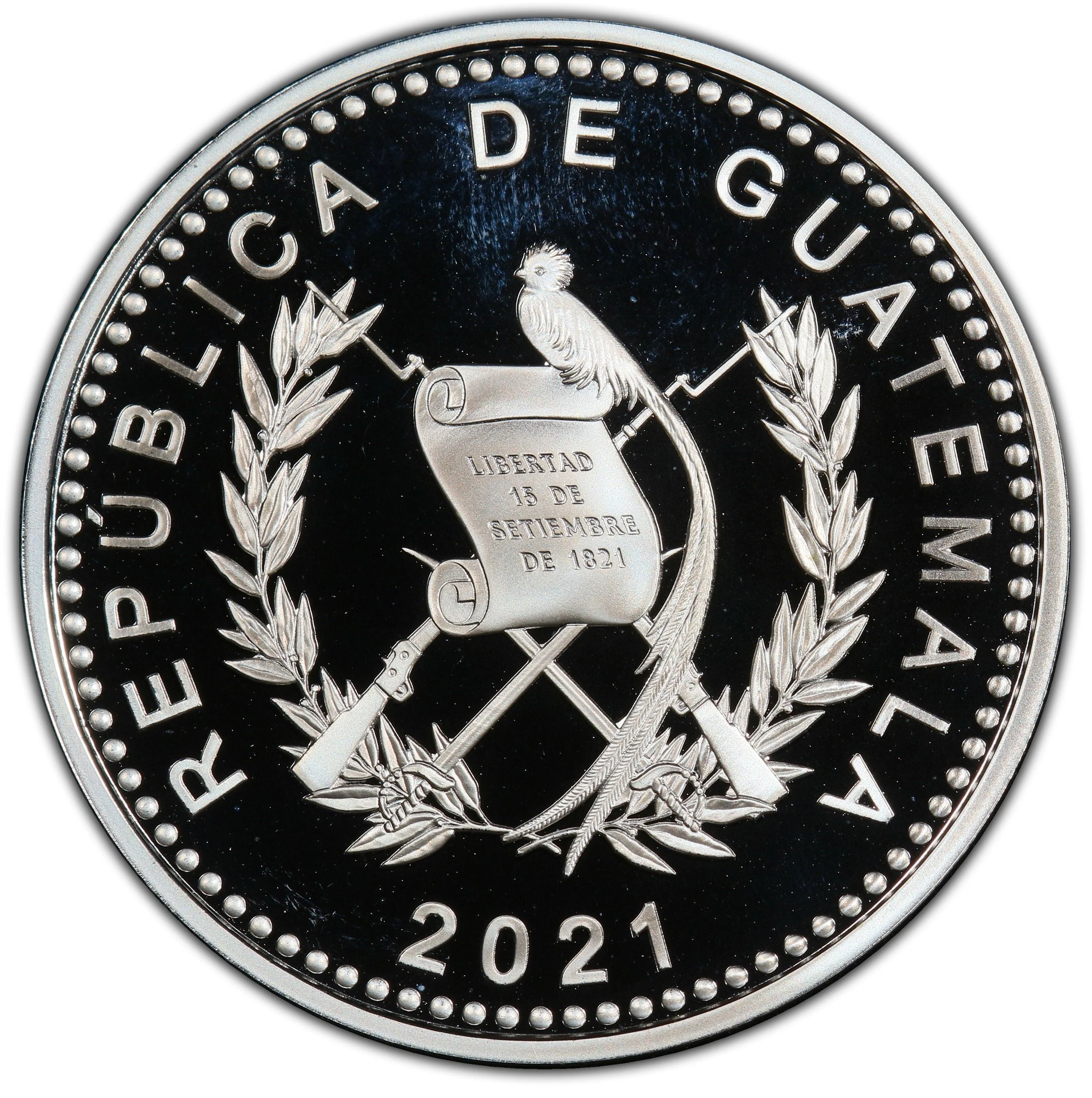 Guatemala's coat of arms encircled by its name, with the date below.