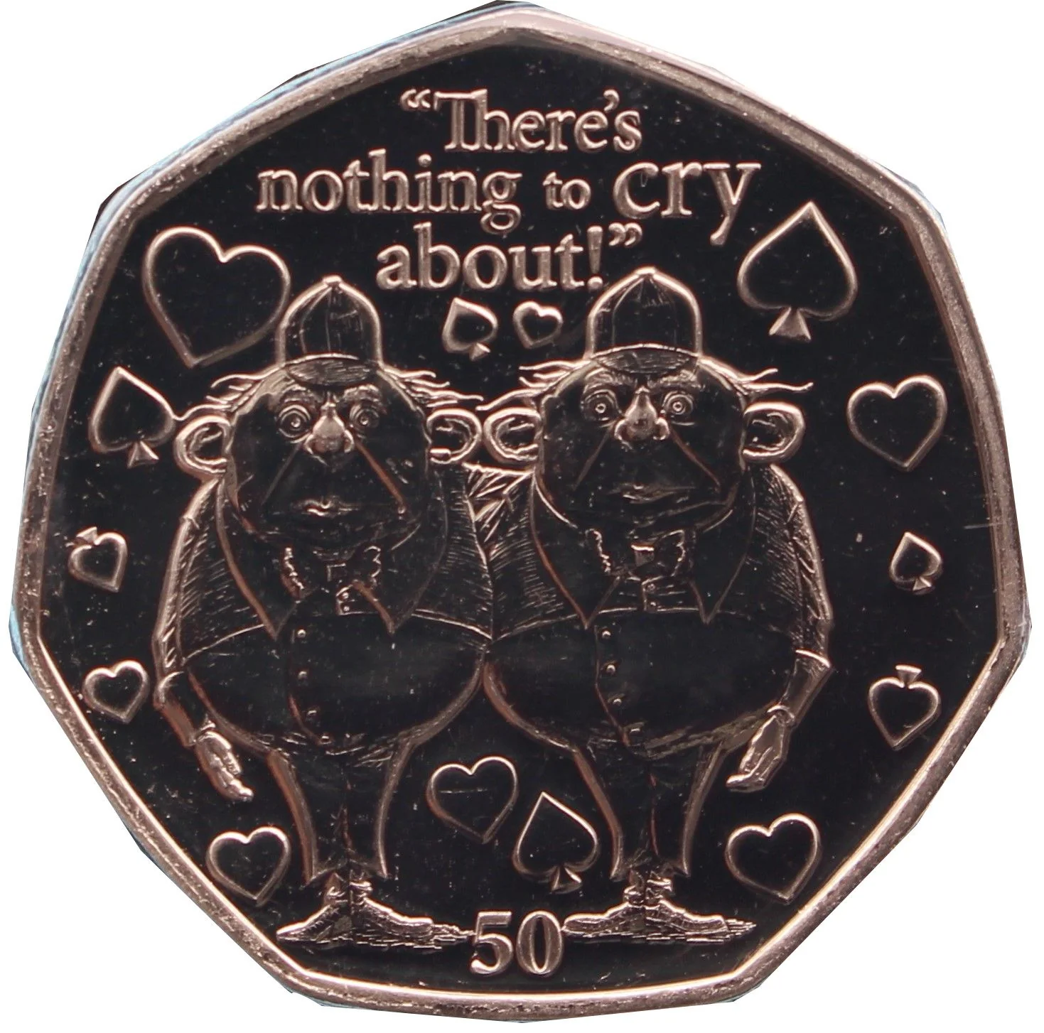 Tweedle Dee and Tweedle Dum faced forward, encircled by hearts and spades.