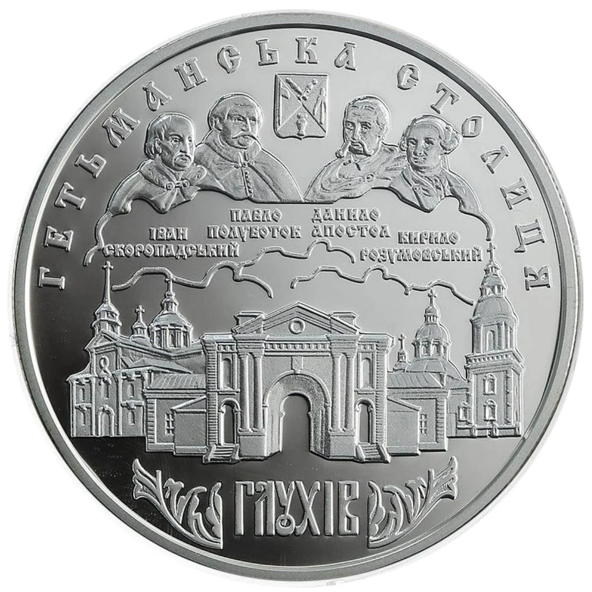 Description: The design shows a stylized town panorama centered on the Kyiv Gate fortress. Above it is the semicircular inscription "ГЕТМАНСЬКА СТОЛИЦЯ" (Hetman’s Capital), below which are the town's coat of arms and four hetmans' portraits labeled: ІВАН СКОРОПАДСЬКИЙ, ПАВЛО ПОЛУБОТОК, ДАНИЛО АПОСТОЛ, and КИРИЛО РОЗУМОВСЬКИЙ. At the bottom, within ornamental patterns, is the word "ГЛУХІВ" (Hlukhiv).