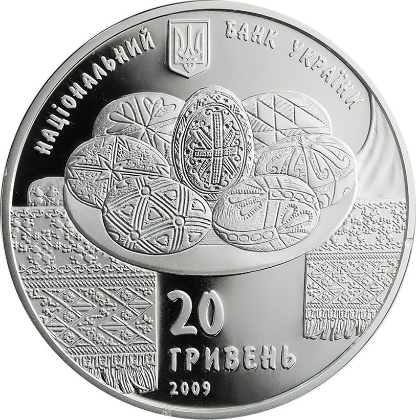 The obverse features Ukraine's Small National Emblem and the inscription "National Bank of Ukraine." The central design shows pysanky (decorated eggs) on a dish against a background of rushnyky (embroidered towels), with patterns from various Ukrainian regions. Below is the denomination "20 hryvnias 2009."