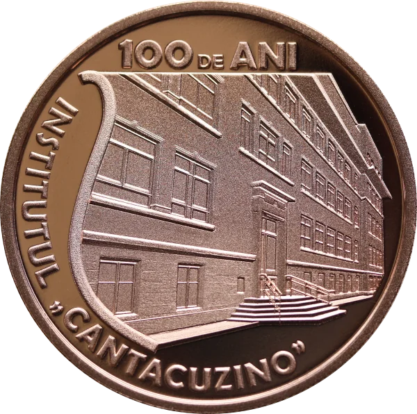 The “Cantacuzino” Institute building with the inscriptions “100 DE ANI” and “INSTITUTUL „CANTACUZINO”.