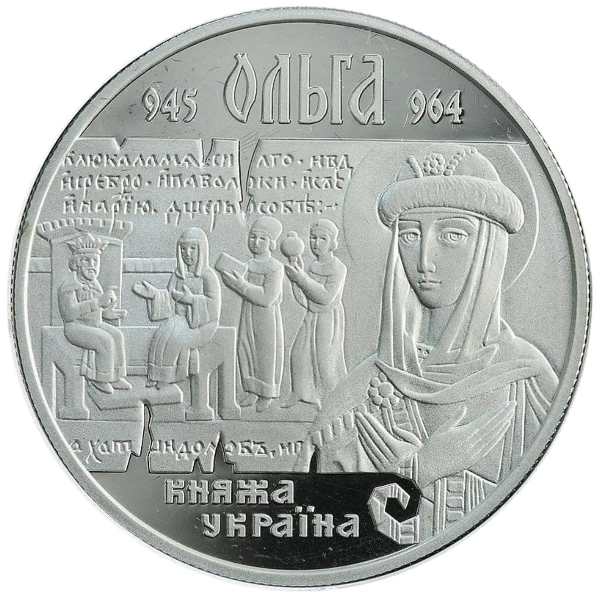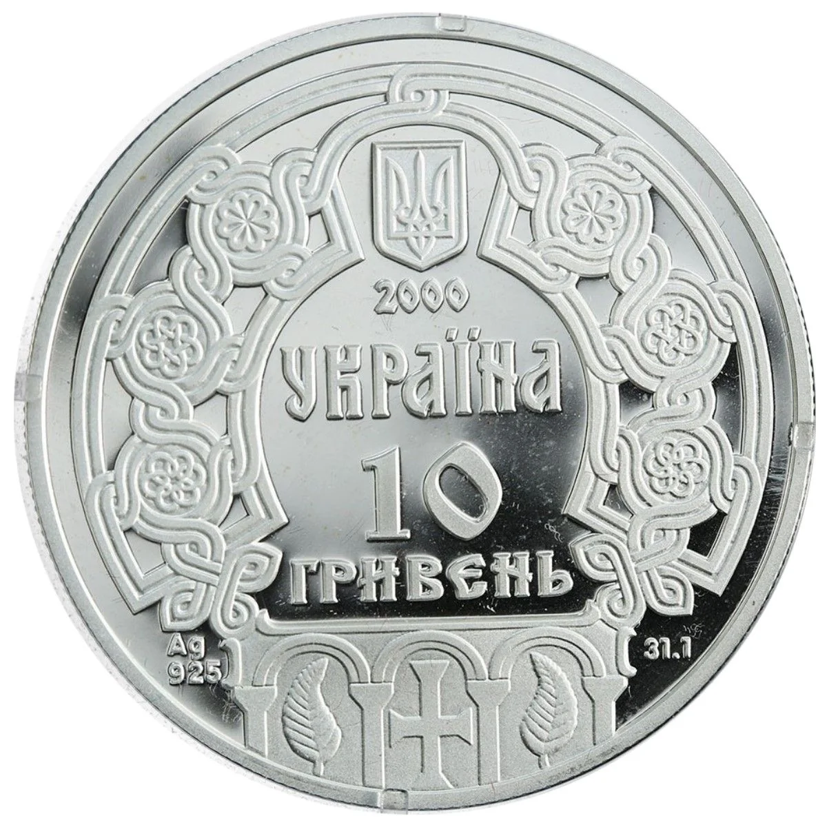 The Princess Olha sarcophagus coin features a traditional Rus ornament framing Ukraine's small National Emblem. It bears the inscriptions "2000 / УКРАЇНА / 10 / ГРИВЕНЬ" and includes the metal's specification, fineness, and weight.