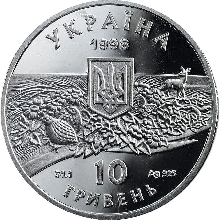 Description: Ukraine's Small State Emblem set against a steppe landscape of local flora and fauna. Above the emblem: "УКРАЇНА 1998". Below: "10 ГРИВЕНЬ" (face value), with "31,1" (weight) and "Ag 925" on either side.