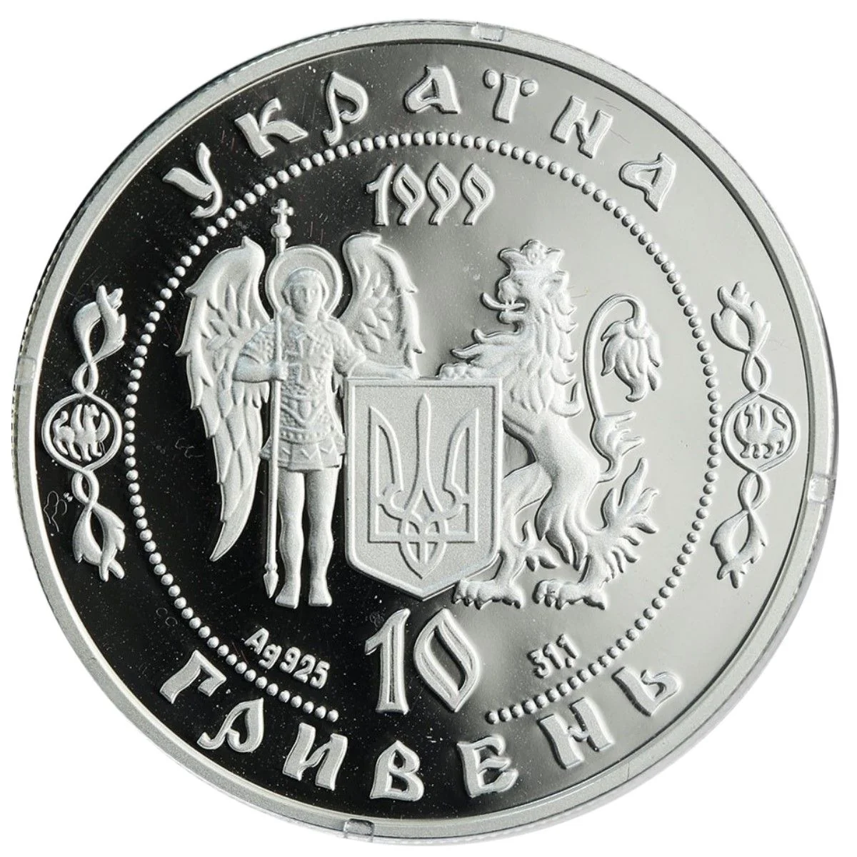 Description: This coin is part of a series representing a unified Ukraine. It features the small National Emblem alongside the symbols of Kyiv (Archangel Michael) and Lviv (a crowned lion). The inscriptions state: УКРАЇНА, 10 ГРИВЕНЬ, 1999, Ag 925, and 31.1 g. Baroque ornamentation separates the text.