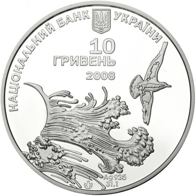 Description: A sea wave and gull are depicted. Above them are the small National Emblem of Ukraine, the semicircular inscription "НАЦІОНАЛЬНИЙ БАНК УКРАЇНИ", and the inscriptions: "10 ГРИВЕНЬ/ 2008", the metal designation Ag 925, and its fine weight of 31.1.