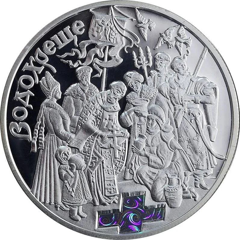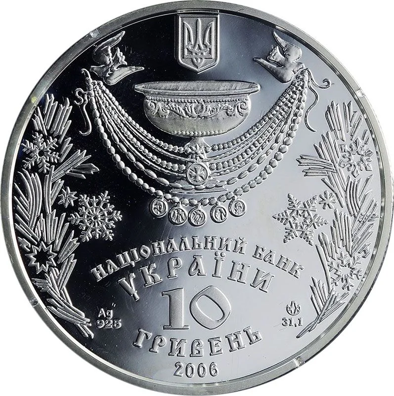 Description: A composition of Ukrainian female adornments held by doves with a church chalice; above is the Small National Emblem of Ukraine. Below: НАЦІОНАЛЬНИЙ БАНК / УКРАЇНИ / 10 / ГРИВЕНЬ / 2006. Indicated: Ag 925, 31.1g. Flanked by frozen twigs with snowflakes and the Mint logo.