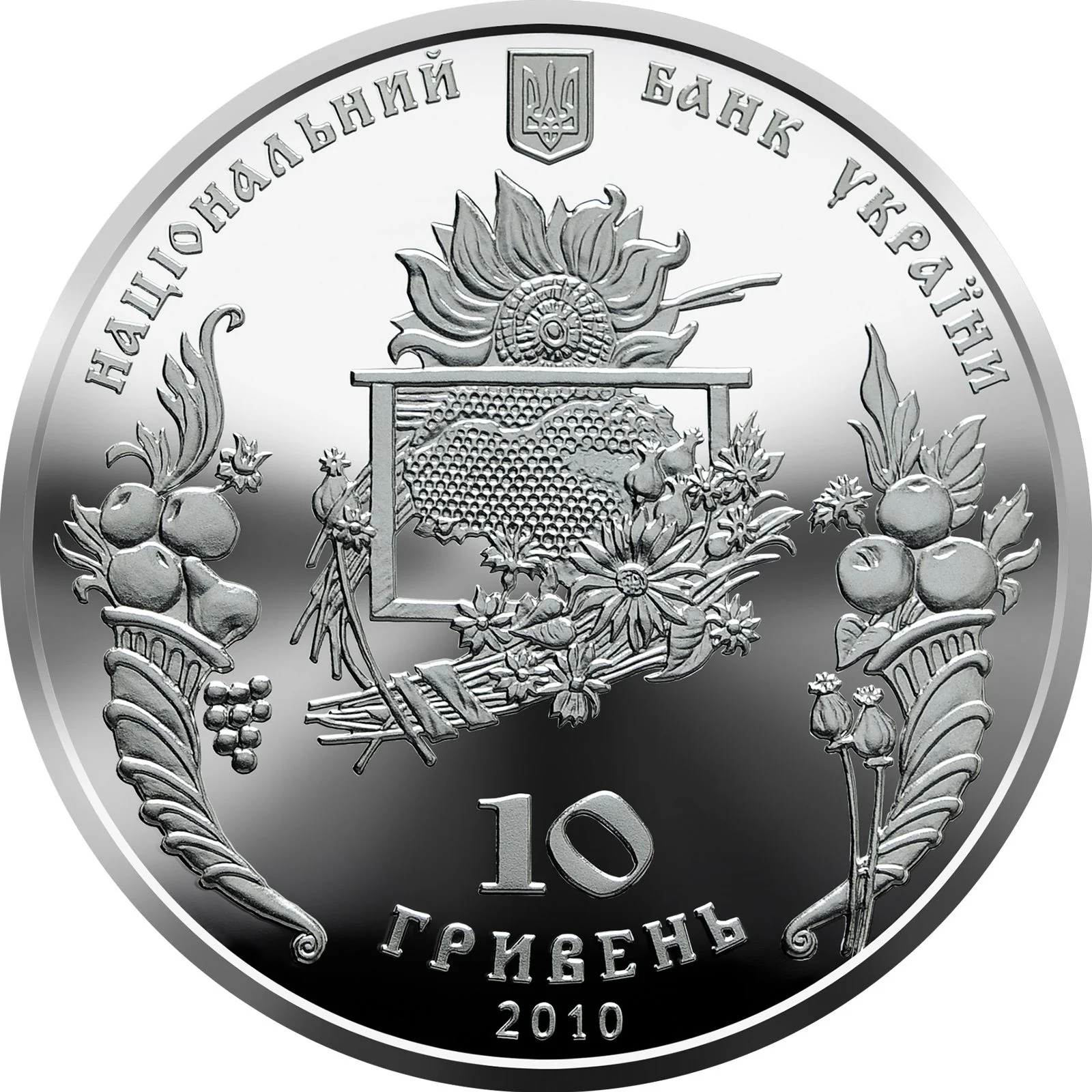 The obverse features Ukraine's Small Coat of Arms and the inscription "НАЦІОНАЛЬНИЙ БАНК УКРАЇНИ." The central design symbolizes the Savior's Feast, showing a honeycomb frame and a floral amulet with a sunflower, flanked by stylized cornucopias filled with fruit. Below is the denomination "10 ГРИВЕНЬ 2010" and the Mint logo.