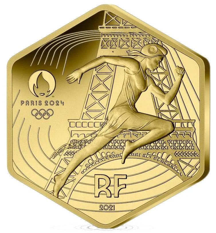 Marianne sprinting before the Eiffel Tower on a stylized track, with the Paris 2024 Olympic logo at left.