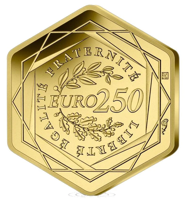 A laurel and oak branch flank the face value, encircled by the French motto and three hexagons.