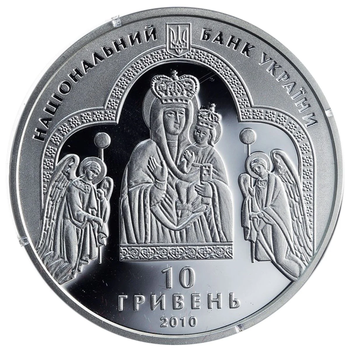 The obverse features the Small Coat of Arms of Ukraine with the inscription "НАЦІОНАЛЬНИЙ БАНК УКРАЇНИ" above, and the denomination "10 ГРИВЕНЬ" with the year "2010" below. The central design is the Our Lady of Zarvanytsia icon, flanked by angels from its iconostasis.