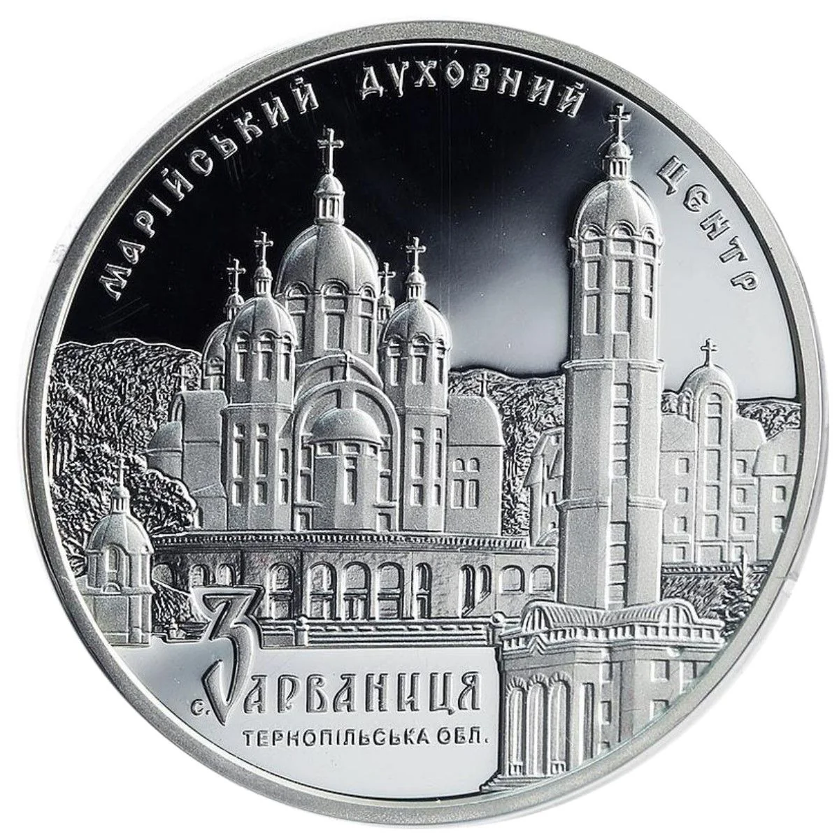 The Zarvanytsia Cathedral complex, with its bell tower, bears the inscriptions: "МАРІЙСЬКИЙ ДУХОВНИЙ ЦЕНТР" above and "с. ЗАРВАНИЦЯ/ТЕРНОПІЛЬСЬКА ОБЛ." below.