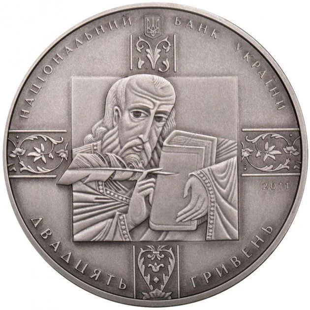 Description: The obverse features Ukraine's small coat of arms with the inscription "National Bank of Ukraine." Below is the face value "twenty hryvnias" and the year 2011, all over a cross-shaped ornamental background with a stylized figure of the Peresopnytsia Gospels maker.