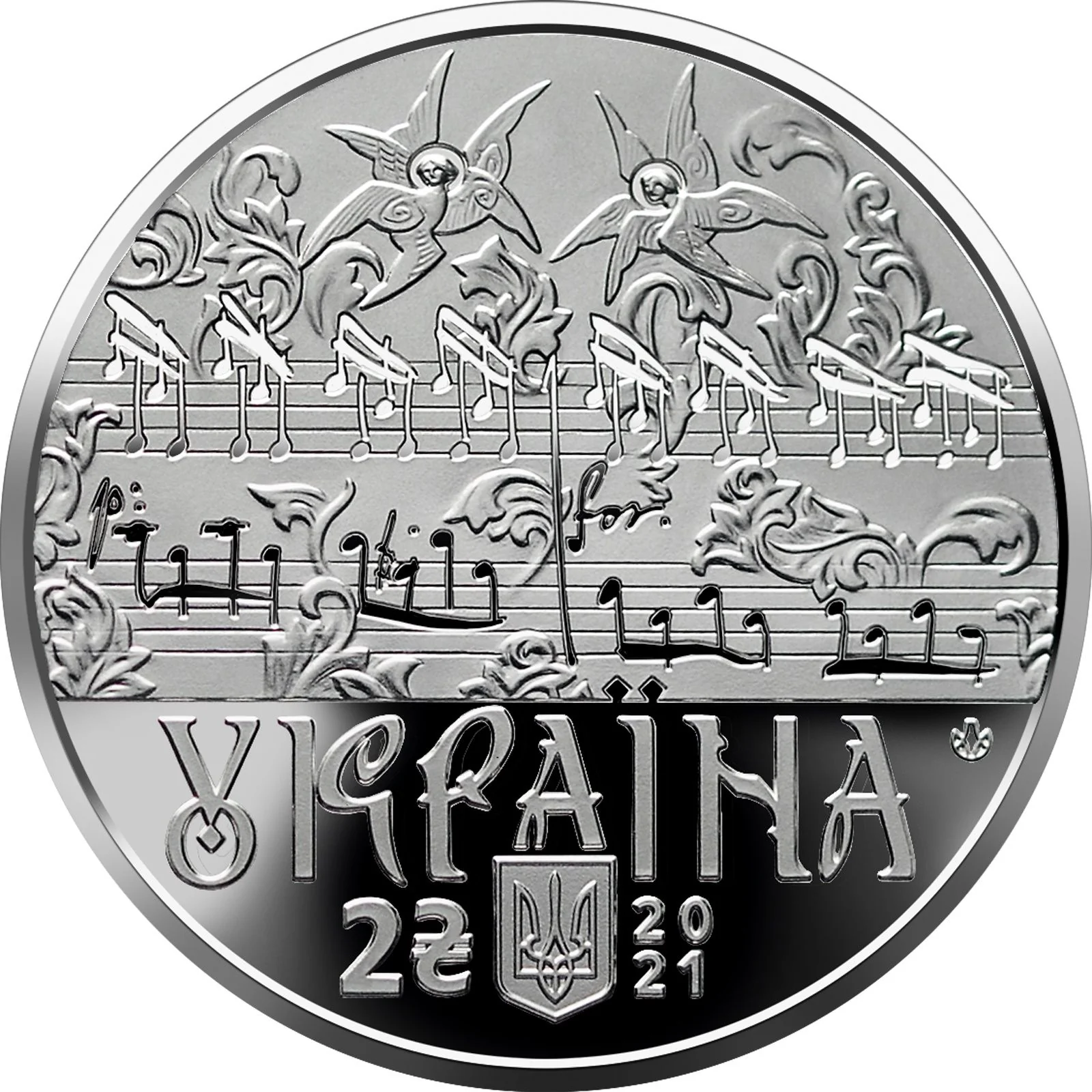 Description: A Baroque floral backdrop frames handwritten sheet music, topped by a six-winged seraphim symbolizing the composer's spiritual grandeur and divine aspiration. Below, on a smooth field, is the word УКРАЇНА in the RuteniaDecor script, above Ukraine's small coat of arms. Flanking the coat of arms are the face value "2" with the hryvnia symbol (left) and the issue year "20/21" (right). The mint mark of the NBU's Banknote Printing and Minting Works is at the bottom right.