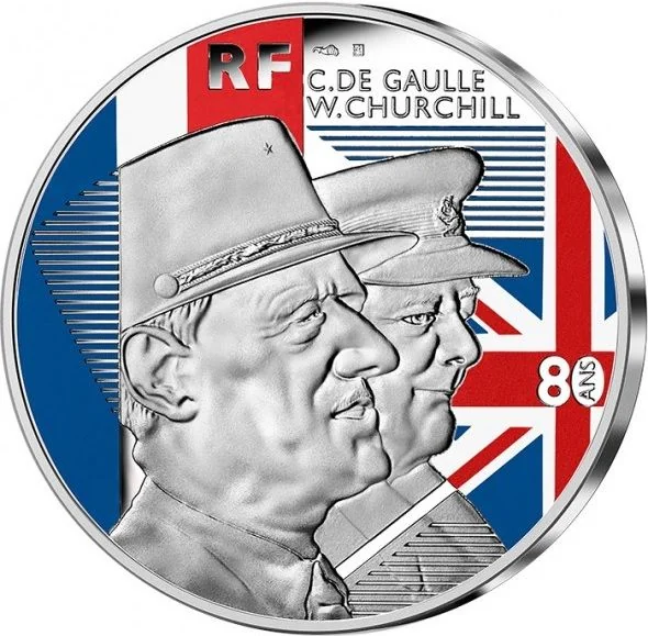 The obverse features profiles of Charles de Gaulle and Winston Churchill in military uniform, with their names above. The French and British flags are shown in color, with "RF" on the French flag and "80 ANS" on the British flag, marking 80 years since Free France was created in London.