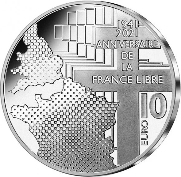 The reverse features France and Great Britain against a shared background, symbolizing their WWII alliance. The Cross of Lorraine, representing Free France, is accompanied by the legend "1941-2021 ANIVERSAIRE DE LA FRANCE LIBRE" and the "10 EURO" face value.
