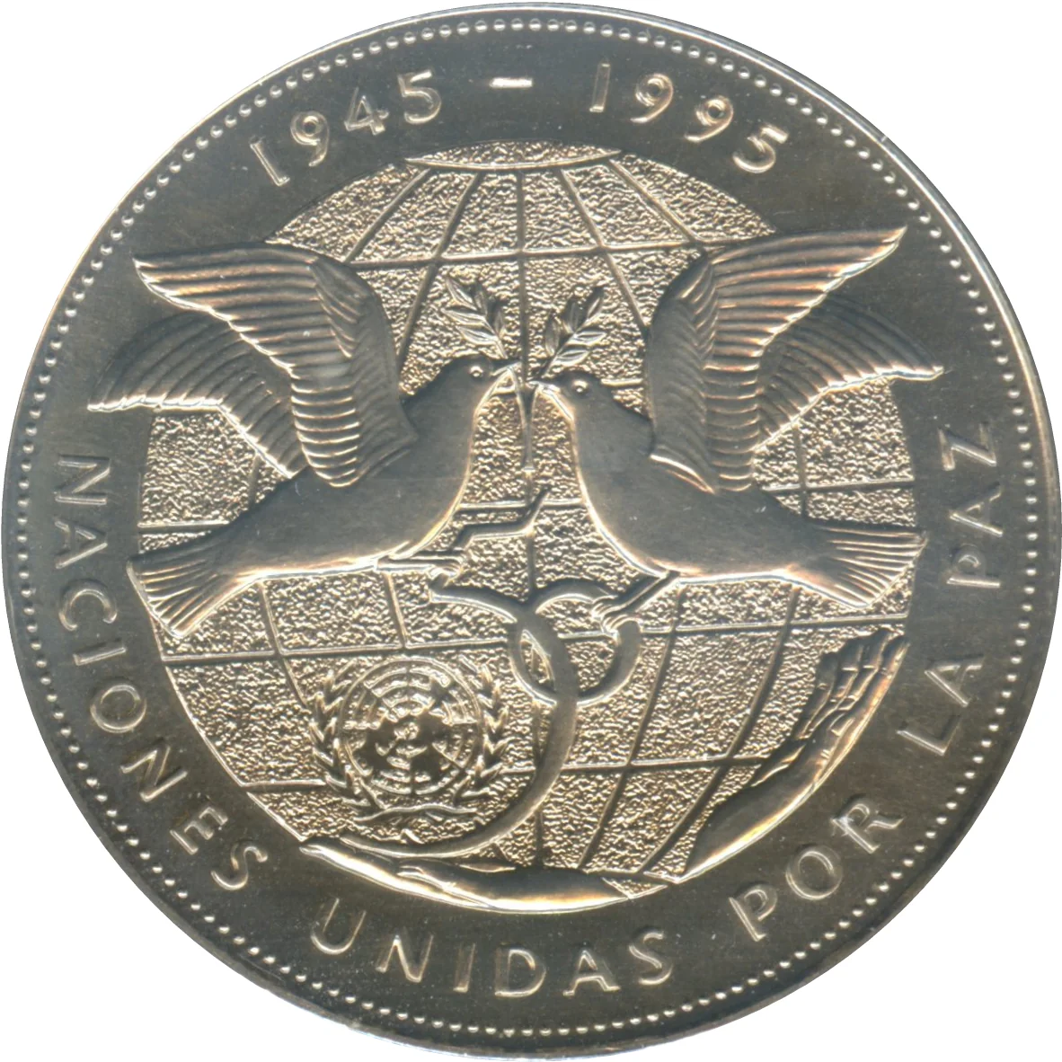 UN Logo with doves and dates.