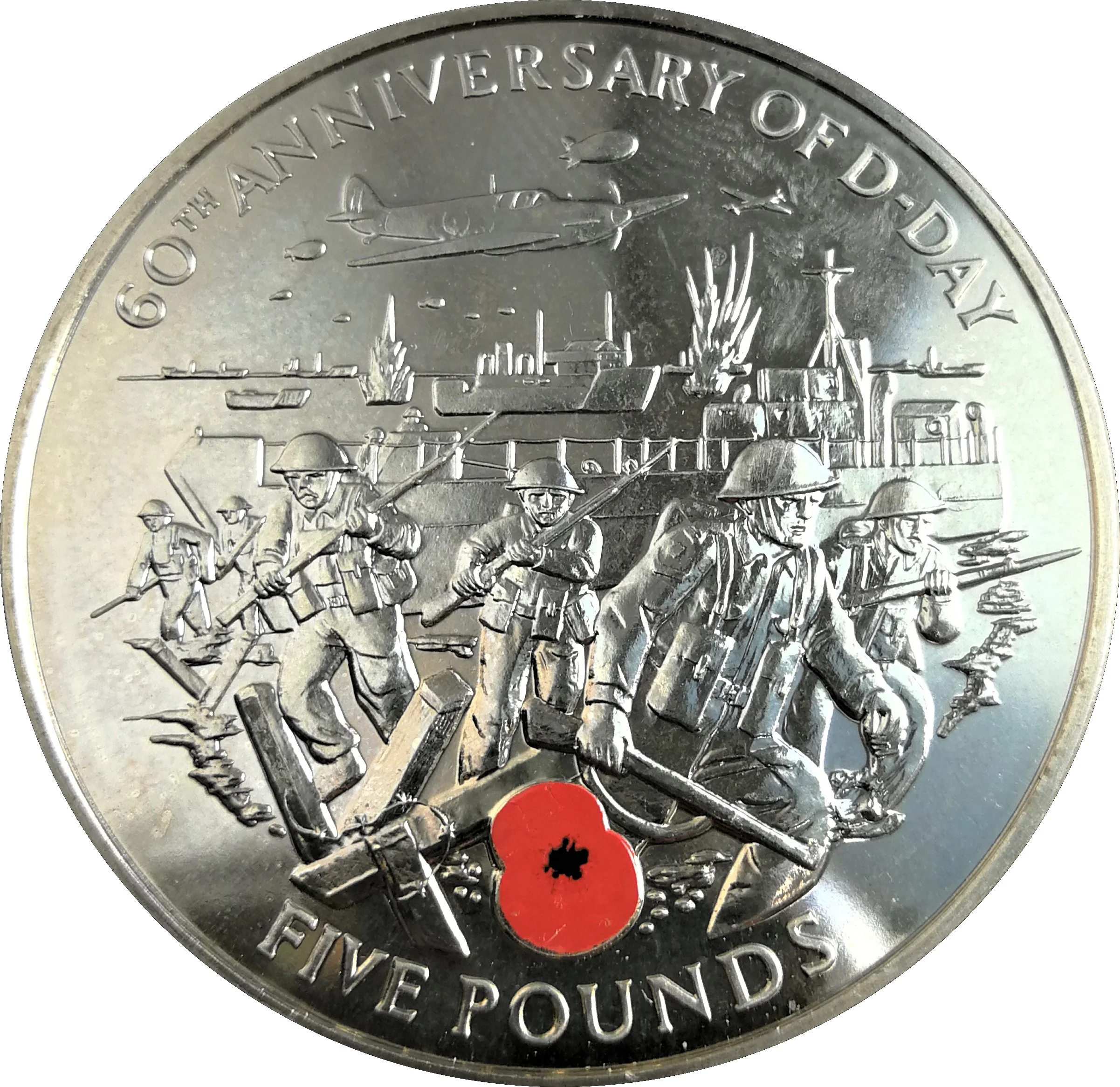 British troops storm ashore, with landing craft, aircraft, and barrage balloons overhead. A red poppy is at the bottom.