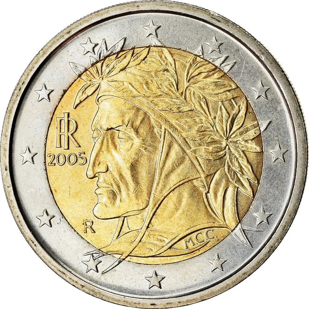 A Raphael portrait of Dante in the Vatican's Pope Julius II Wing, ringed by Europe's twelve stars. Left: date, republic monogram, mintmark. Artist's initials below the neck.