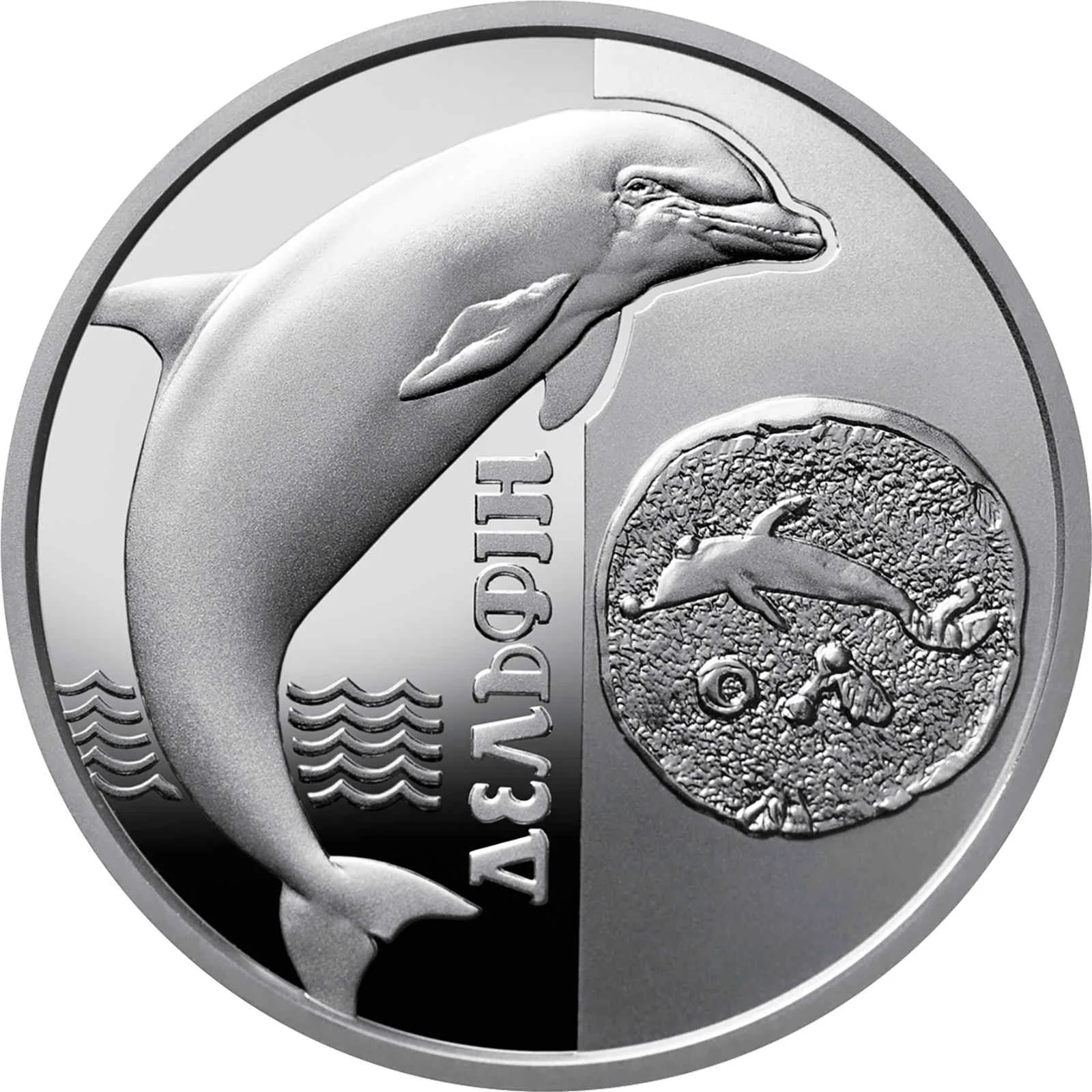 Left: a dolphin and stylized waves on a smooth background, with the vertical text "ДЕЛЬФІН." Right: an Olbian coin featuring a dolphin, on a matt background.