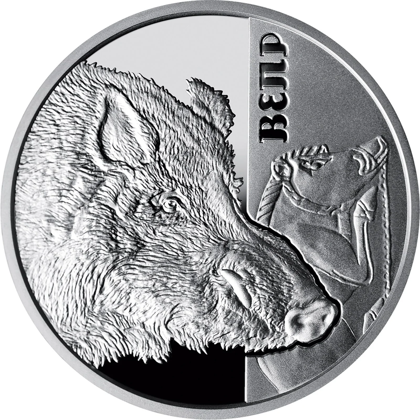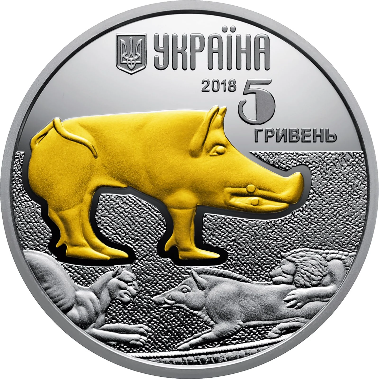 The coin features Ukraine's small coat of arms and the word "УКРАЇНА," with the year 2018 and face value 5 hryvnias below. Centered is a gilt boar, based on a Scythian gold figurine (late 4th century B.C.). Beneath it, on a matt background, is a battle scene from the Gold Pectoral of the Thick Grave (mid-4th century B.C.).