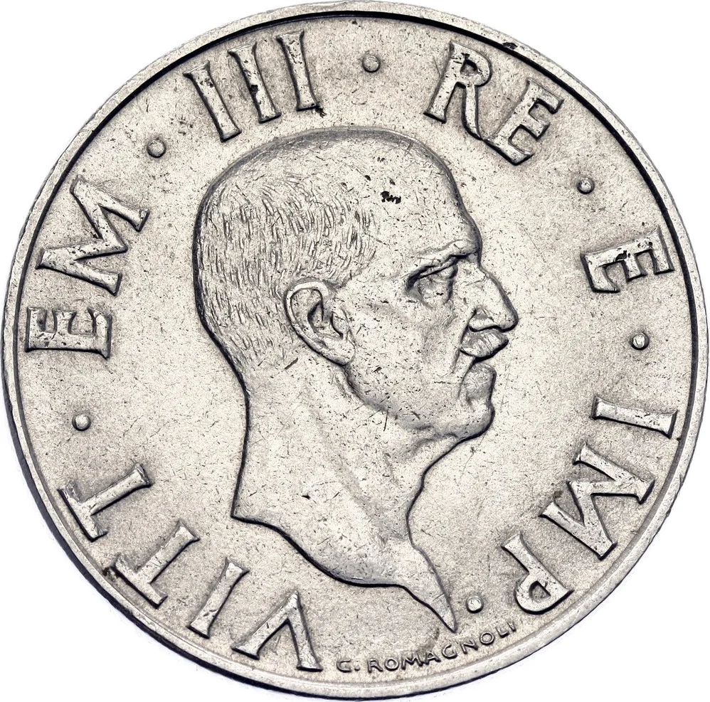 Profile eagle left, wings spread, clutching a fasces, within a laurel wreath. The Savoy shield at top divides the date and value; mint mark and Fascist Era year flank the value below.