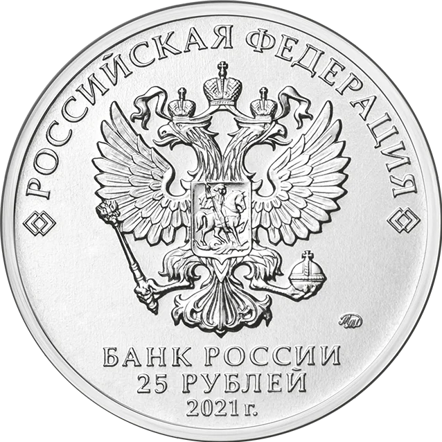 Centered is the national coat of arms with "РОССИЙСКАЯ ФЕДЕРАЦИЯ" above it, flanked by double rhombuses. Below are "БАНК РОССИИ", "25 РУБЛЕЙ", and "2021 г.", with the mint mark to the right.