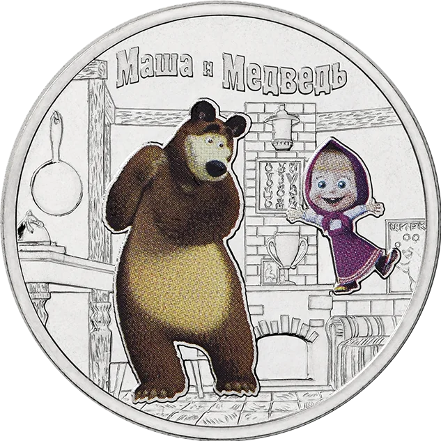 Masha and the Bear characters in color before a relief of Bear's house interior, with the title "Маша и Медведь" above.